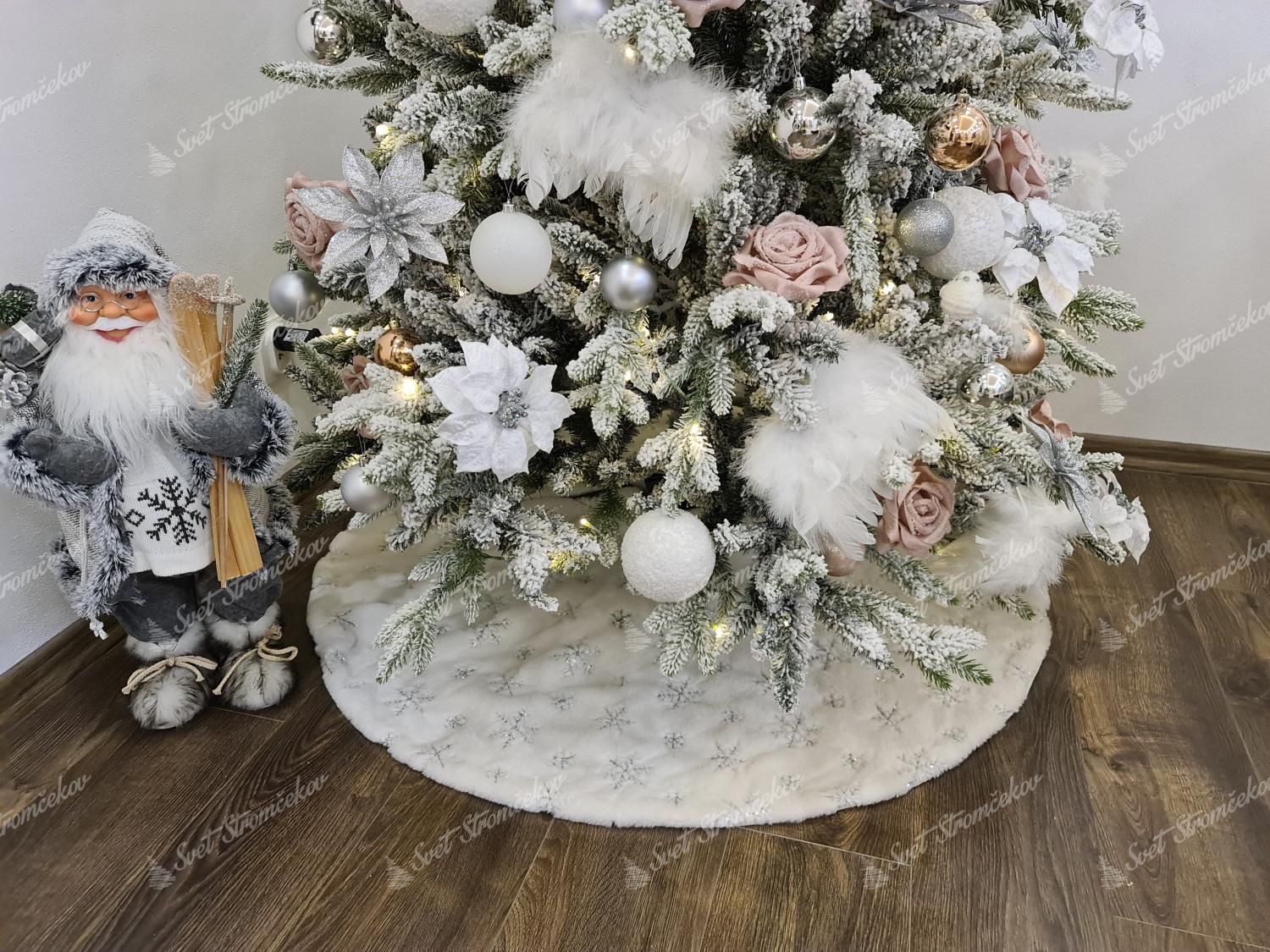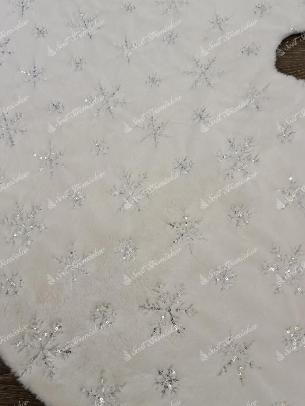 Tento elegantný biely koberec pod vianočný stromček je ozvláštnený o vkusné snehové vločky v striebornej farbe. Koberec pod stromček má kratší chlp a je veľmi príjemný a mäkký na dotyk. Strieborné vločky, ktorými je koberec posiaty sú dvoch rôznych veľkostí a tvoria ich malé flitre striebornej farby.