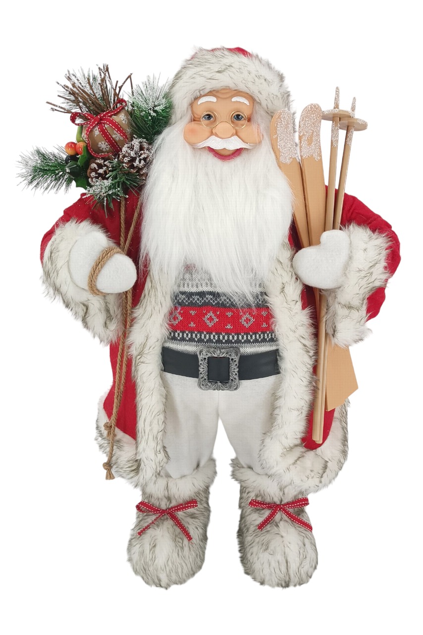Červeno-biely Santa Claus je detailne spracovaný. Prepracovanú tváričku mu zdobia okrúhle okuliare a hustá biela brada. V rukách drží štýlovo doladené doplnky, ako vrece s darčekmi a čečinou, či lyže.