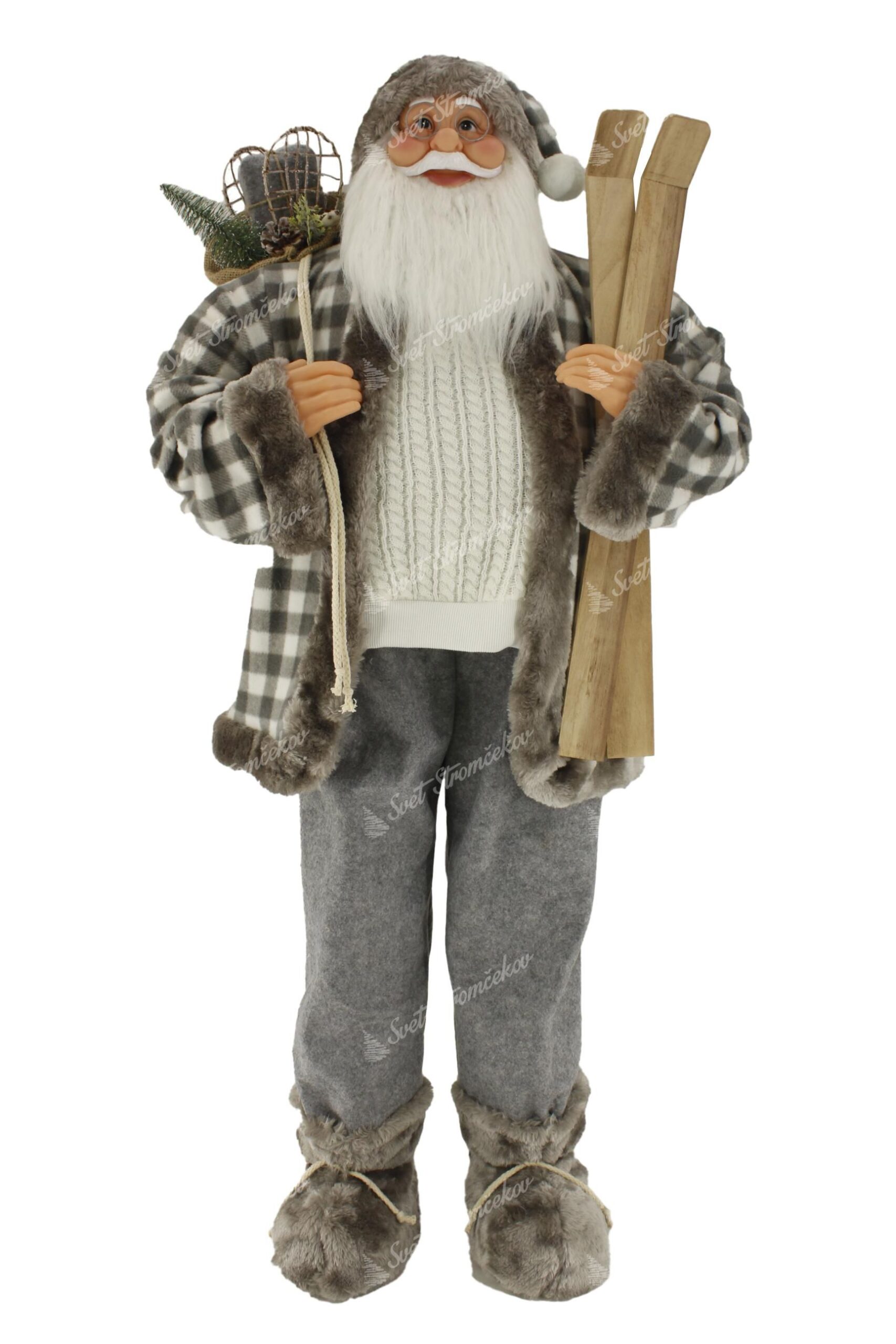 Šedý Santa Claus je detailne spracovaný. Realisticky pôsobiacu tváričku mu zdobia okrúhle okuliare a hustá biela brada. V rukách drží štýlovo doladené doplnky, ako vrece s darčekmi, čečinu, či lyže.