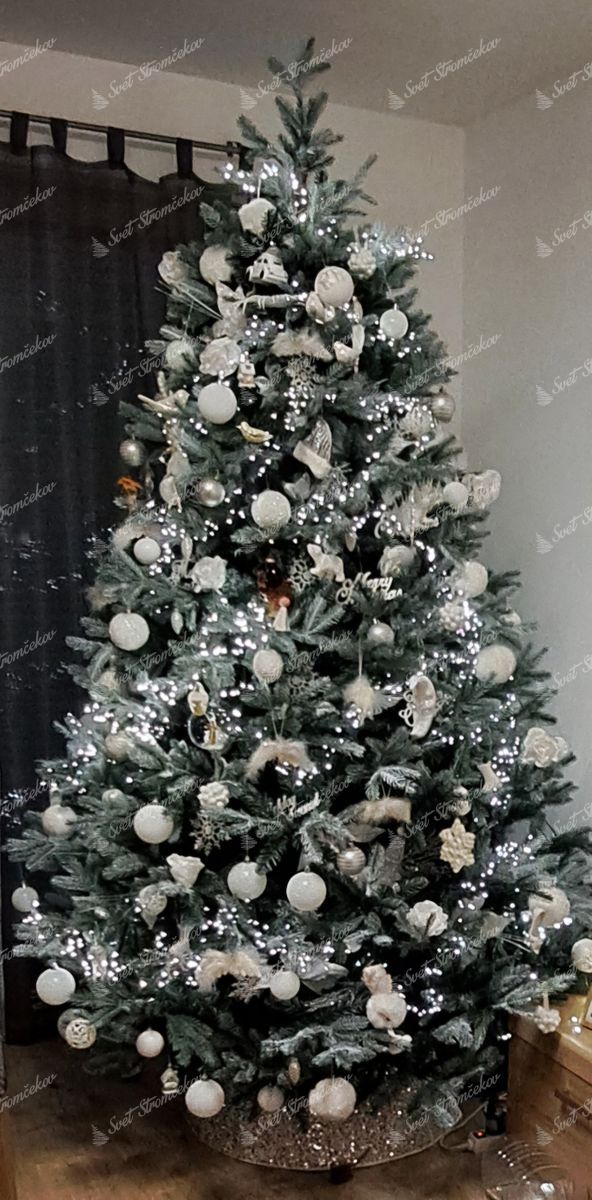 umelý vianočný stromček 3D, výška  240cm, šírka 160cm, typ ihličia – 3D (PE) + PVC, smrekové 3D ihličie exkluzívnej zeleno-striebornej farby, prevedenie – hustý, dĺžka špičky  20cm, kovový stojan, počet častí – 3