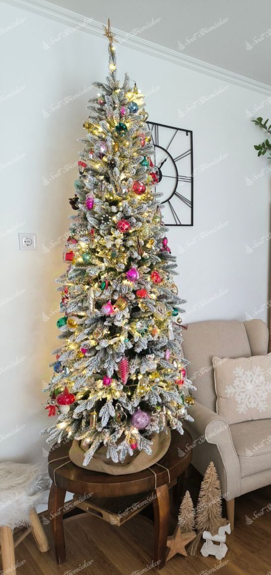 Štýlový vianočný stromček, 3D Smrek Kráľovský Štíhly, je užšou verziou jedného z našich najobľúbenejších zasnežených vianočných stromčekov – 3D Smreka Kráľovského. Tento úzky, zasnežený 3D stromček má jedinečný ľadový vzhľad a tvar dokonalého ihlana. Môžete ho použiť na vianočnú výzdobu stiesnenejších priestorov, práve je pre jeho úzke rozmery.