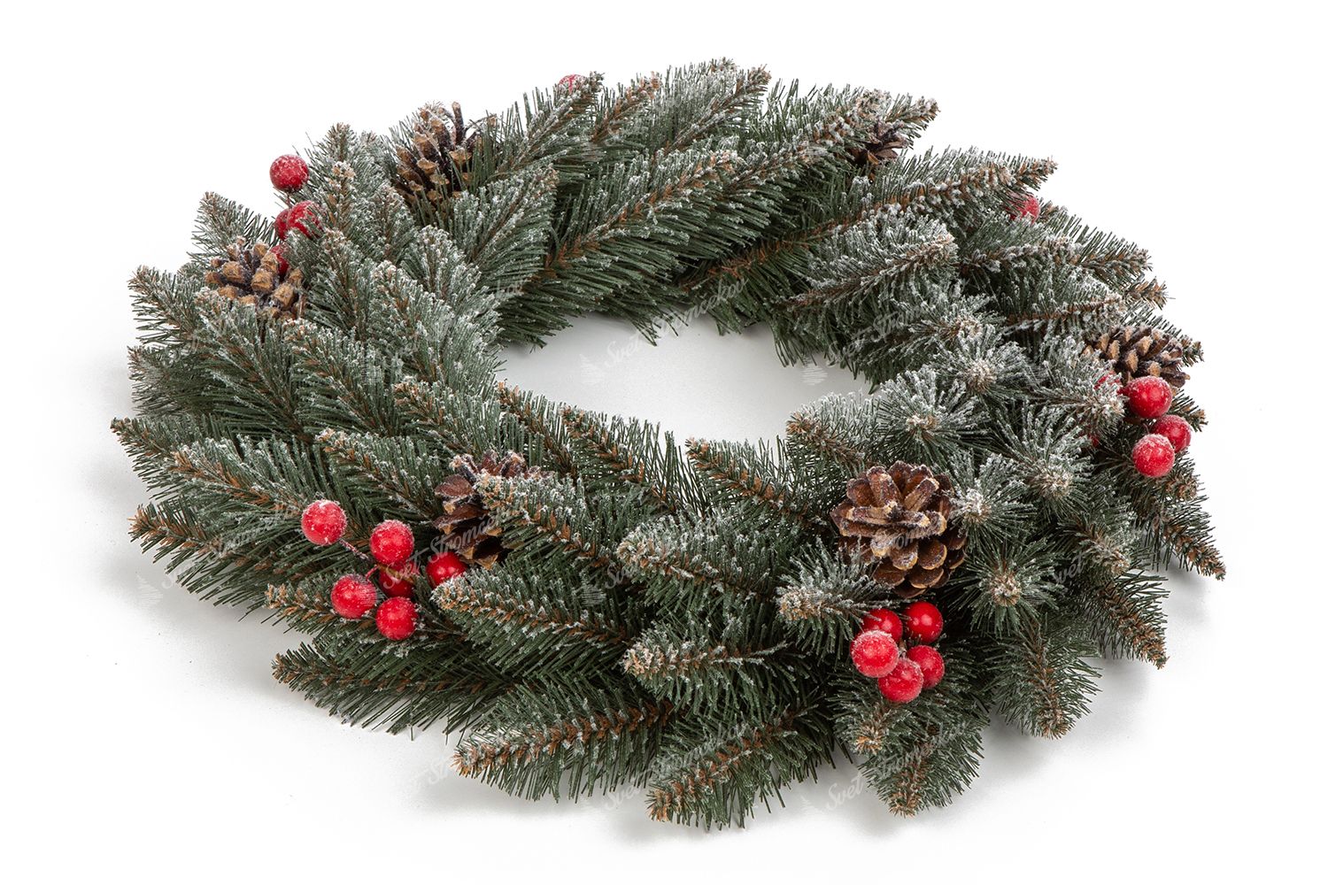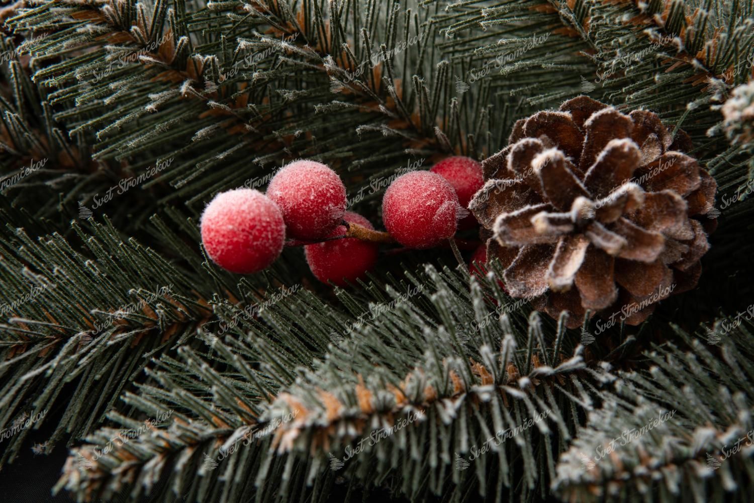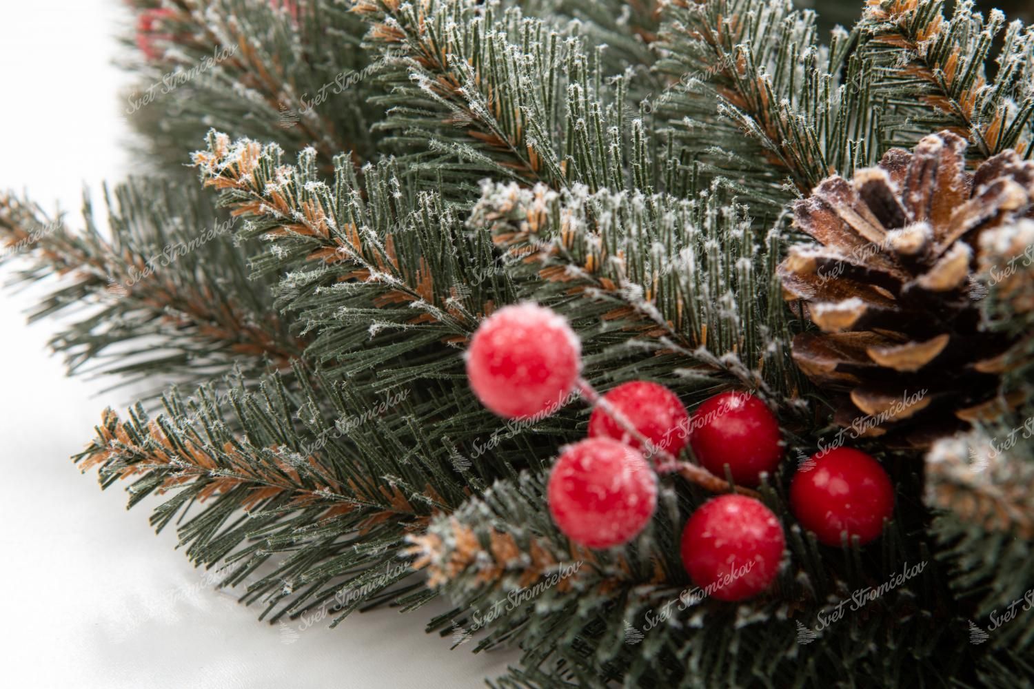 Vianočný veniec Smrek Kryštálový je jedinečný a exkluzívny veniec, ktorý nájdete len u nás. PVC vetvičky tyrkysovo zelenej farby sú posiate malými bielymi chumáčikmi, ktoré pripomínajú kryštáliky ľadu. Tento venček je doplnený o červené lesné plody a šišky z pravej borovice.